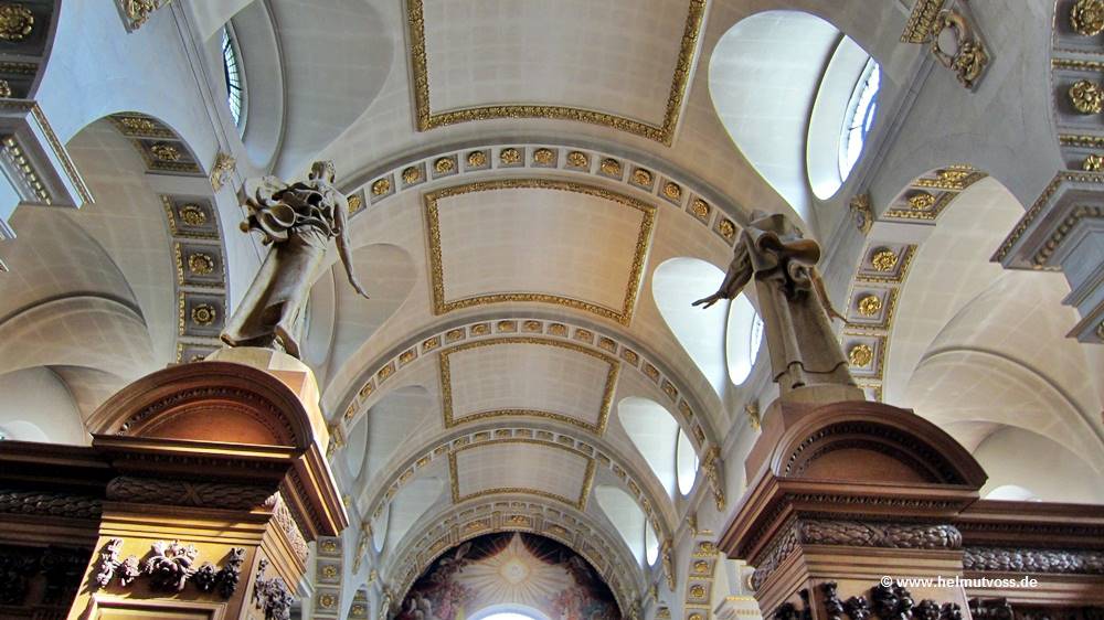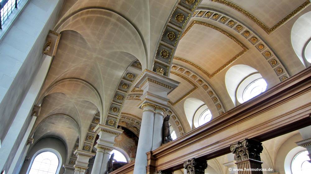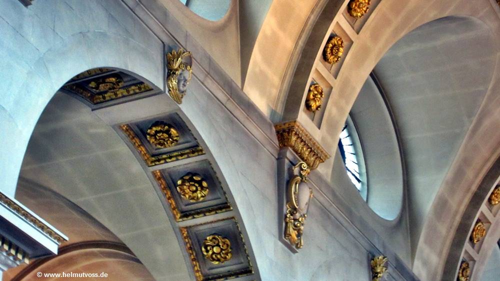 Die Gänge sind in Bögen, mit einem schlichten Kreuzgratgewölbe, mit getäfelten Stuck verziert und zwischen jedem Fach ist ein Quergewölbe mit geflügelten Putten an den Außenwänden.