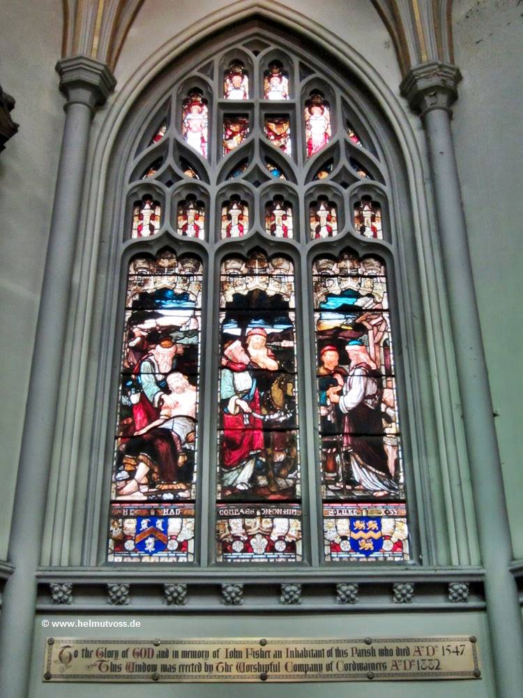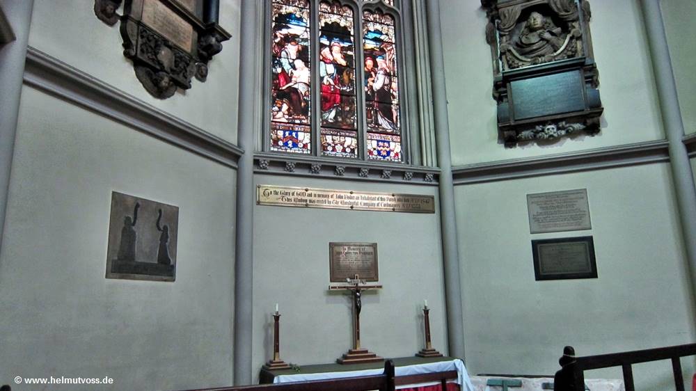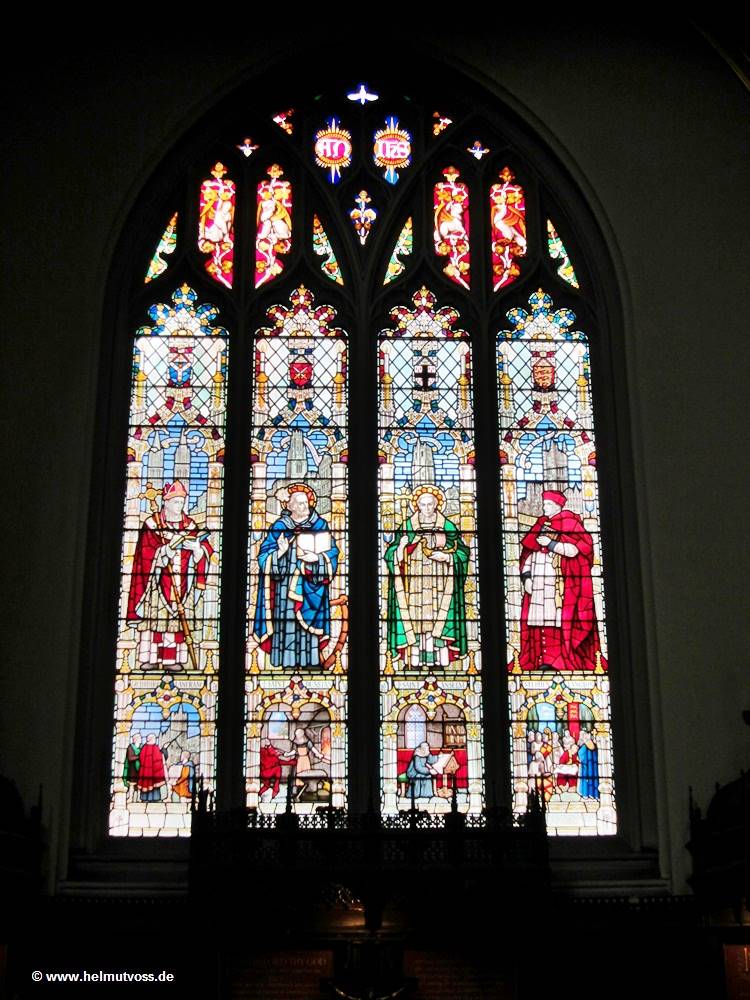 Die vier Glasfenster hinter dem Hochaltar zeigen Erzbischof Lanfrance; St. Dunstan, St. Anselm und Erzbischof Langton mit König Johann bei der Unterzeichnung der Magna Carta.