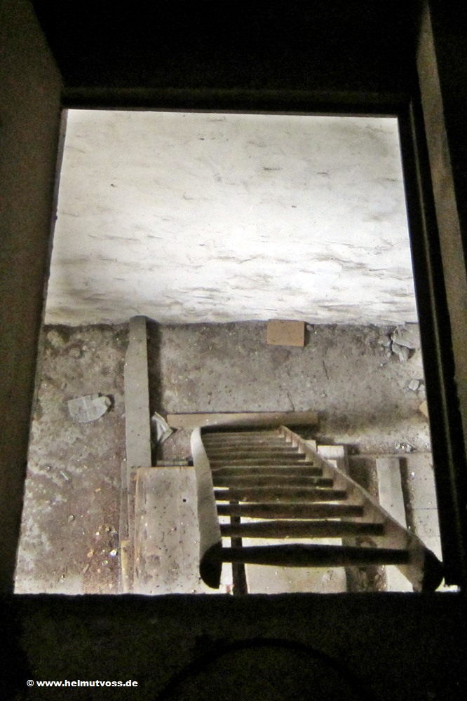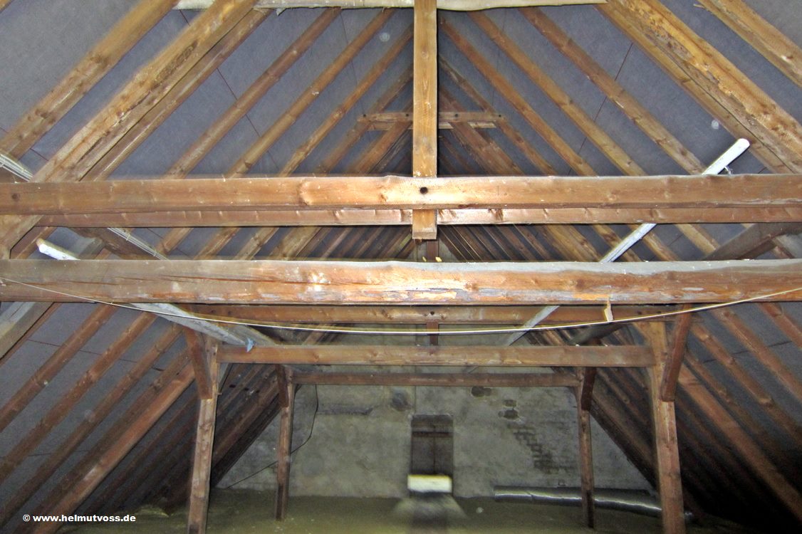 Auf halber Höhe im Turm der Durchgang zum Dachstuhl, hier ein Blick auf das mehr als 100 Jahre alte Gebälk.