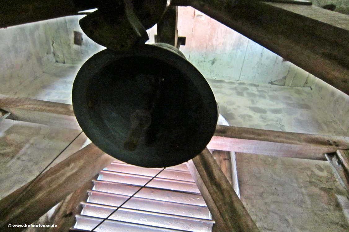 In der Glockenstube, hier ist es sehr eng auf kleinstem Raum, drei Bronzeglocken hängen seit 1982 im Turm am schweren Eichengebälk, nebeneinander auf einer Ebene.