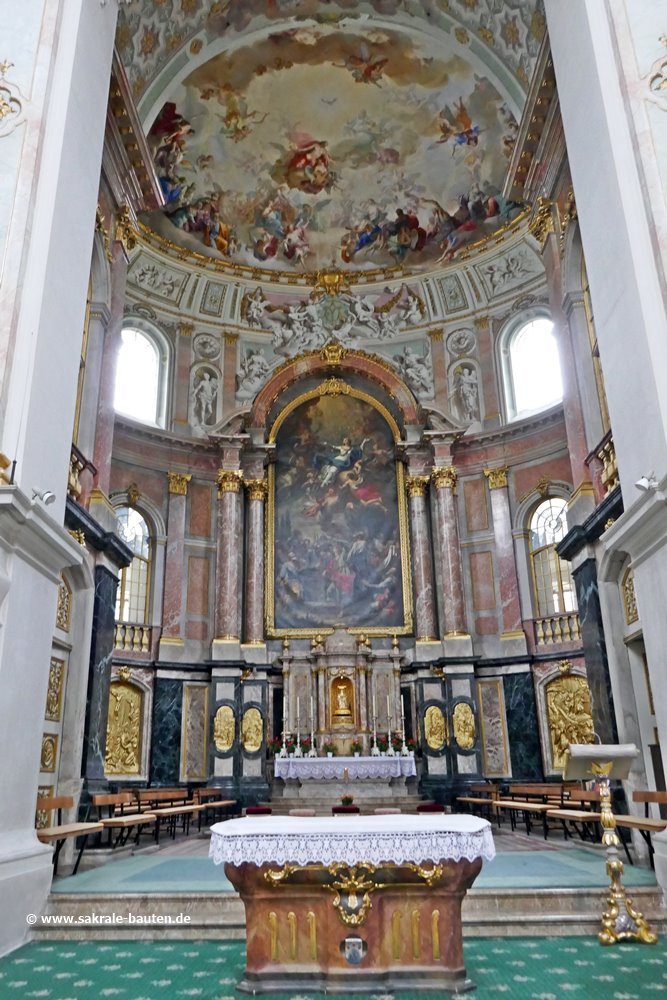 Der 1785 von Joseph Lindner errichtete Hochaltar steht am Ostende des querovalen Chorraums. Das Altarbild wurde 1786 von Martin Knoller gemalt