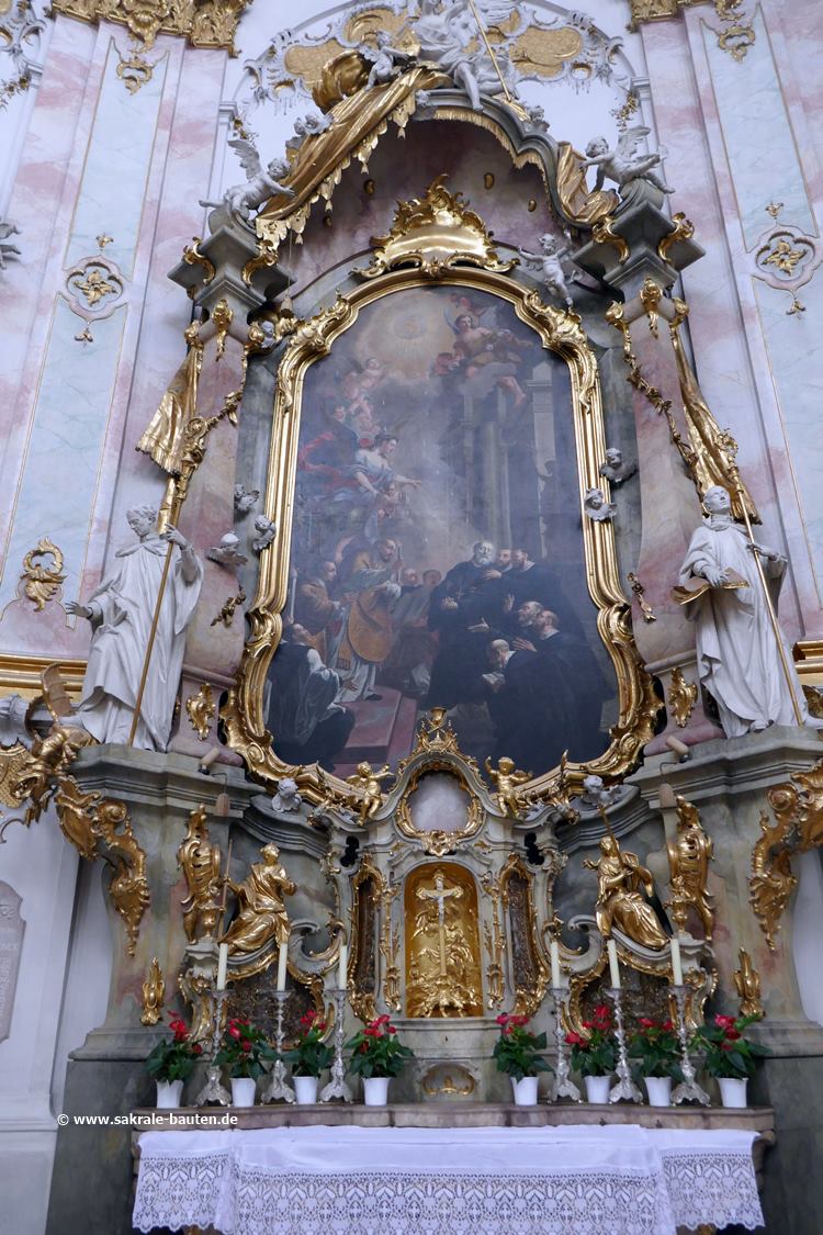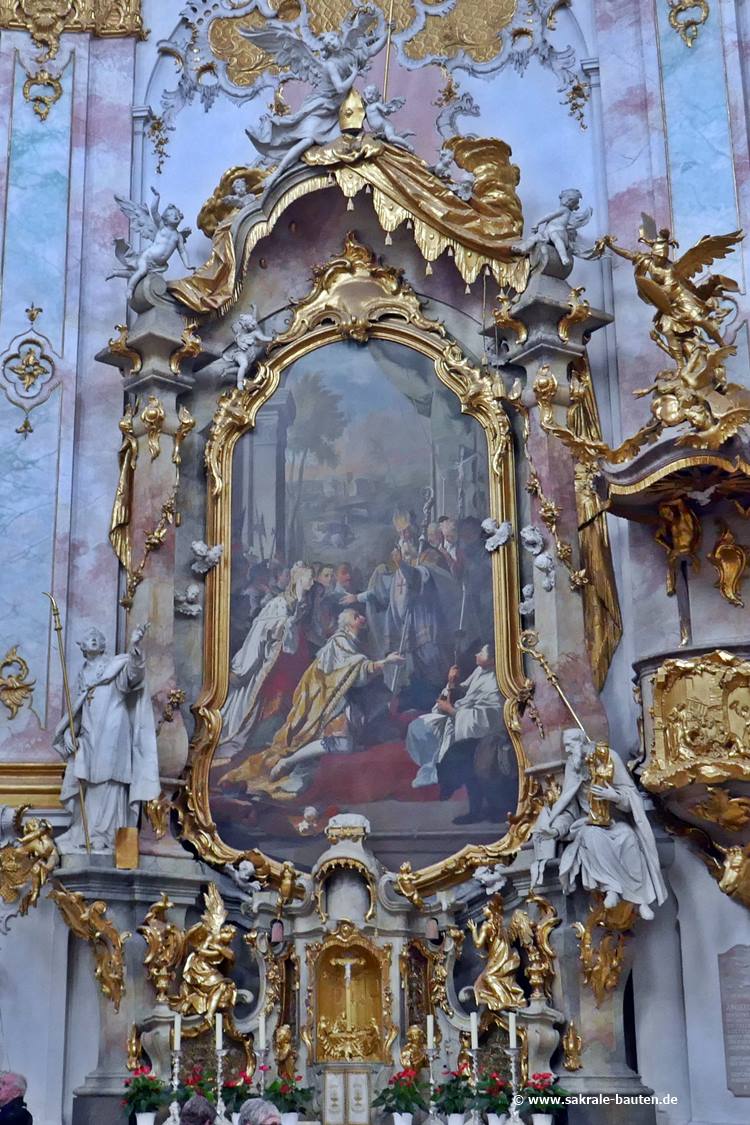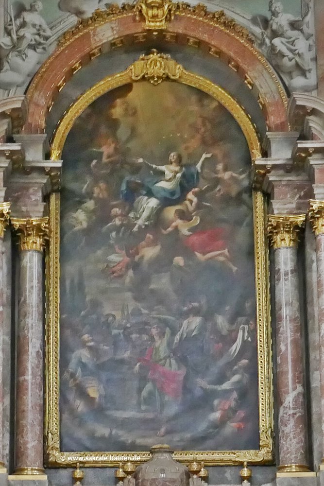 und stellt ebenso wie Knollers Deckengemälde des Chorraums Mariä Aufnahme in den Himmel dar. Flankiert ist das Altarbild von zwei Säulen.