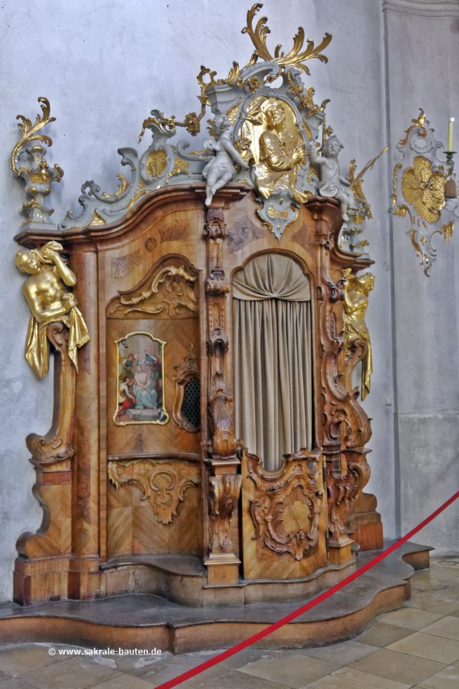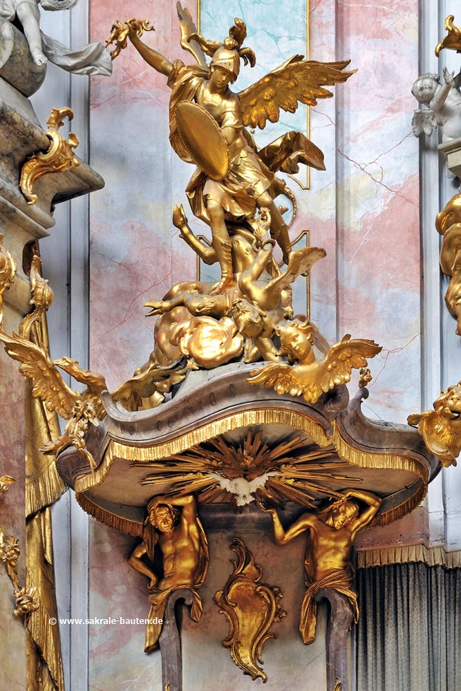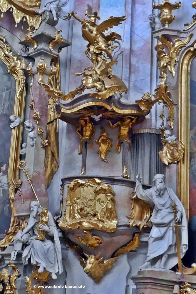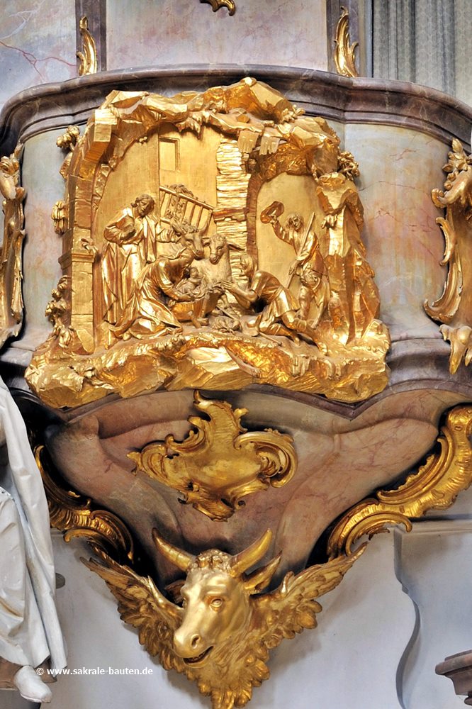 Die Kanzel hängt zwischen den Seitenaltären. Sie wurde 1762 von Johann Baptist Straub errichtet.