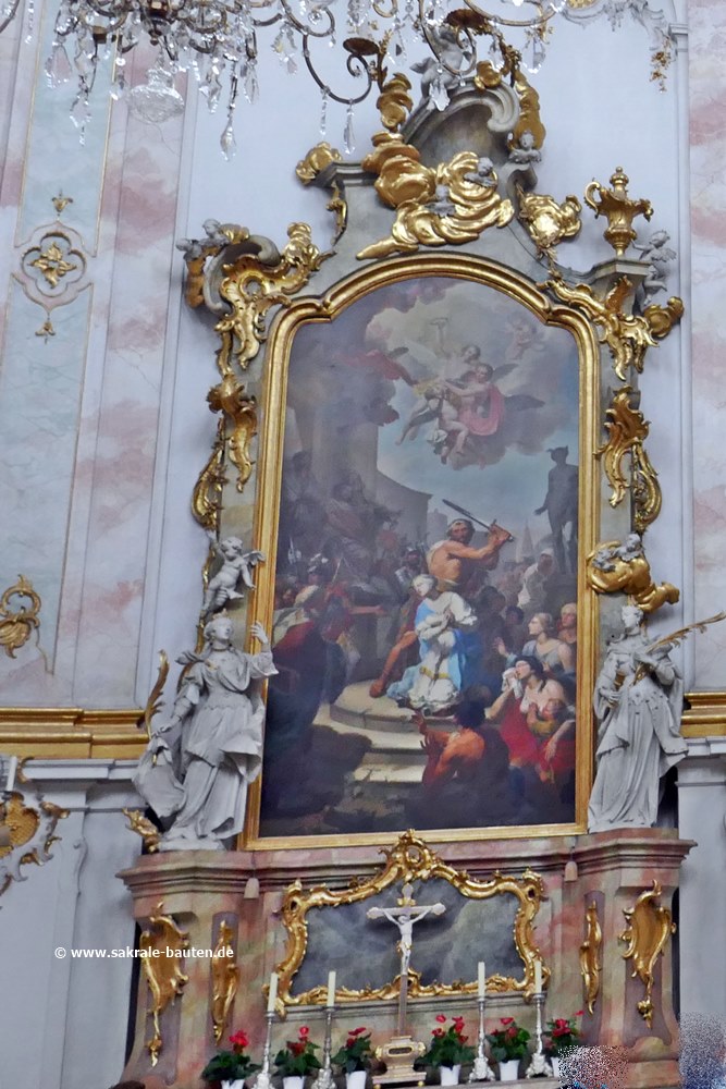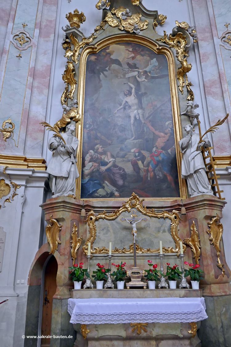 Bild 3: Das Altarbild von Martin Knoller (1765) zeigt das Martyrium des heiligen Sebastian. Flankiert wird das Bild von Figuren der Martyrer Stephanus (links) und Laurentius (rechts).