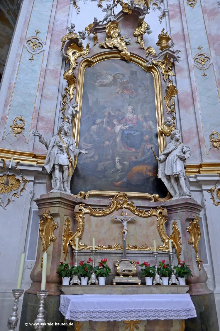 Bild 1: Das Altarbild von Martin Knoller (1794) zeigt die heilige Familie. Flankiert wird das Bild von Figuren des Patriarchen Abraham (links) und des Königs David (rechts).