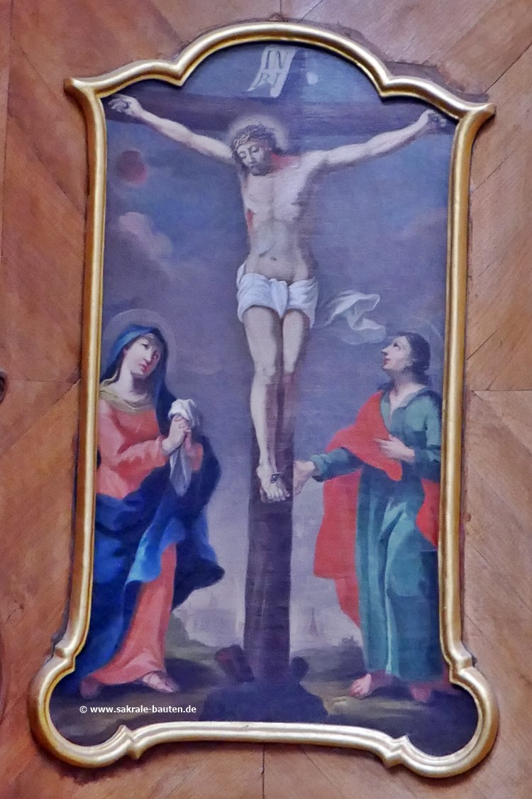 Flankiert wird das Bild von Figuren der Heiligen Magnus (links) und Leonhard (rechts).