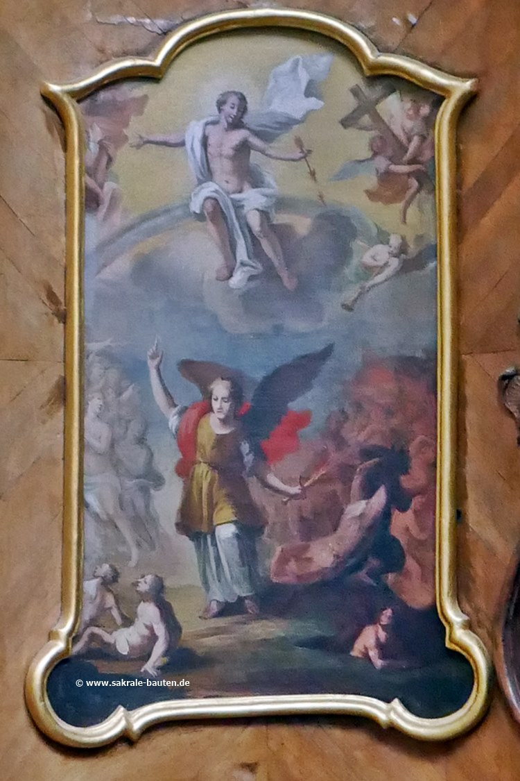 Ein Goldrelief an ihrer Brüstung zeigt die Szene der Geburt Jesu. Auf dem Schalldeckel steht eine Figur des Erzengels Michael.