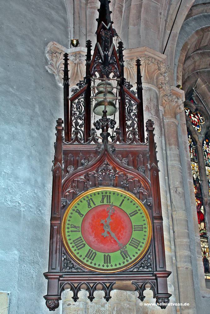 Bild 1: Die monumentale Uhr im Kirchenschiff im Gotischen Stil. Zahlreiche Nebenaltäre sind in den Seitenschiffen.
