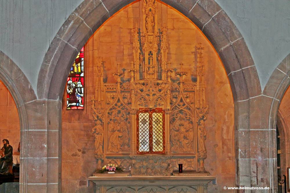 Die Kapelle enthält herrliche Buntglasfenster aus dem 15. Jahrhundert. Bild 2: Der prächtige spätgotische Altar aus weißem Sandstein von Rouffach.
