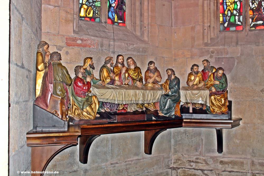 Hier ist eine lebensgroße Skulptur "Das letzte Abendmahl" aus der Zeit der Spätgotik.
