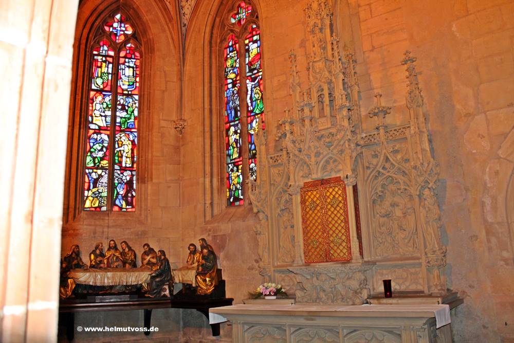 Die seitliche gotischen Kapelle links vom Chor, mit seinen monumentalen Altar, dessen geschnitzte Darstellung des Letzten Abendmahls und seiner herrlichen Fresken.