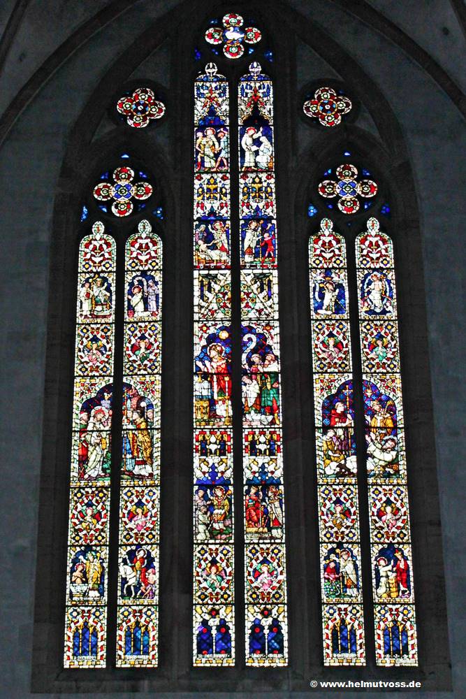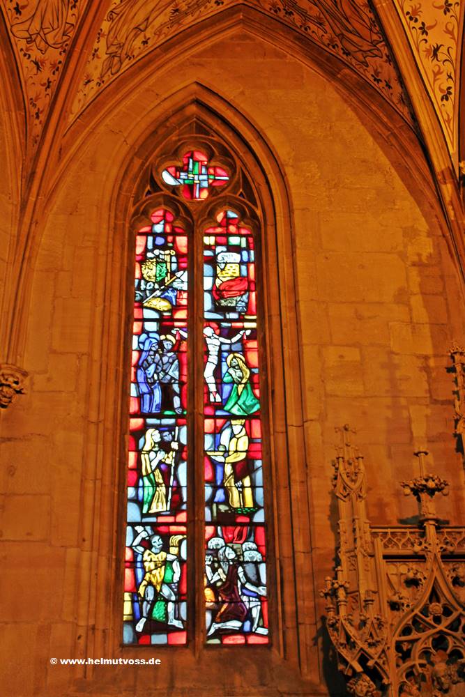 Im inneren Chor die Reihe der Buntglasfenster aus dem 13. Jahrhundert, die biblische Geschichten wie das Letzte Abendmahl,