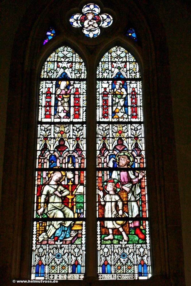Bild 1: Links im Fenster 4tes Glas; Die Himmelfahrt des Elias Glasmalereien aus dem 13. Jahrhundert, Rechts unten im Fenster, das letzte Abendmahl,