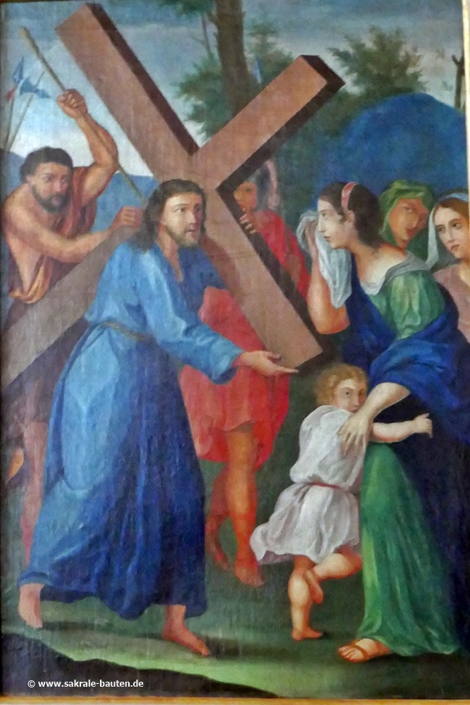 Jesus das Kreuz nachzutragen, findet sich folgender Text: Es folgte eine große Menschenmenge, darunter auch Frauen, die um ihn klagten und weinten. Jesus wandte sich zu ihnen um und sagte: