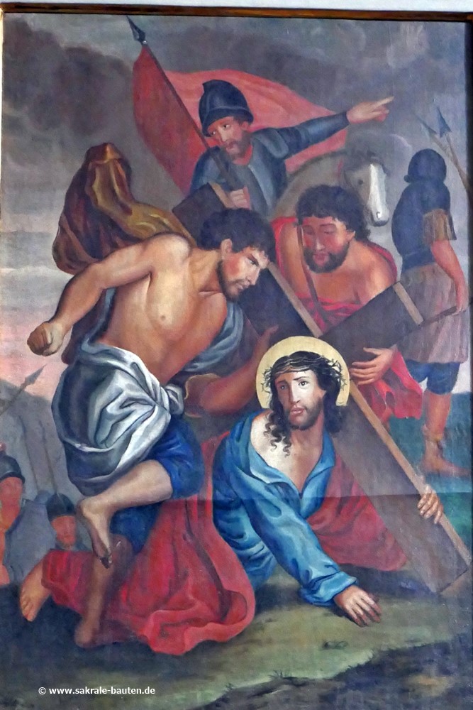 Jesus fällt unter der Last des Kreuzes. Im biblischen Ablauf der Leidensgeschichte Jesu gibt es diese Szene nicht.