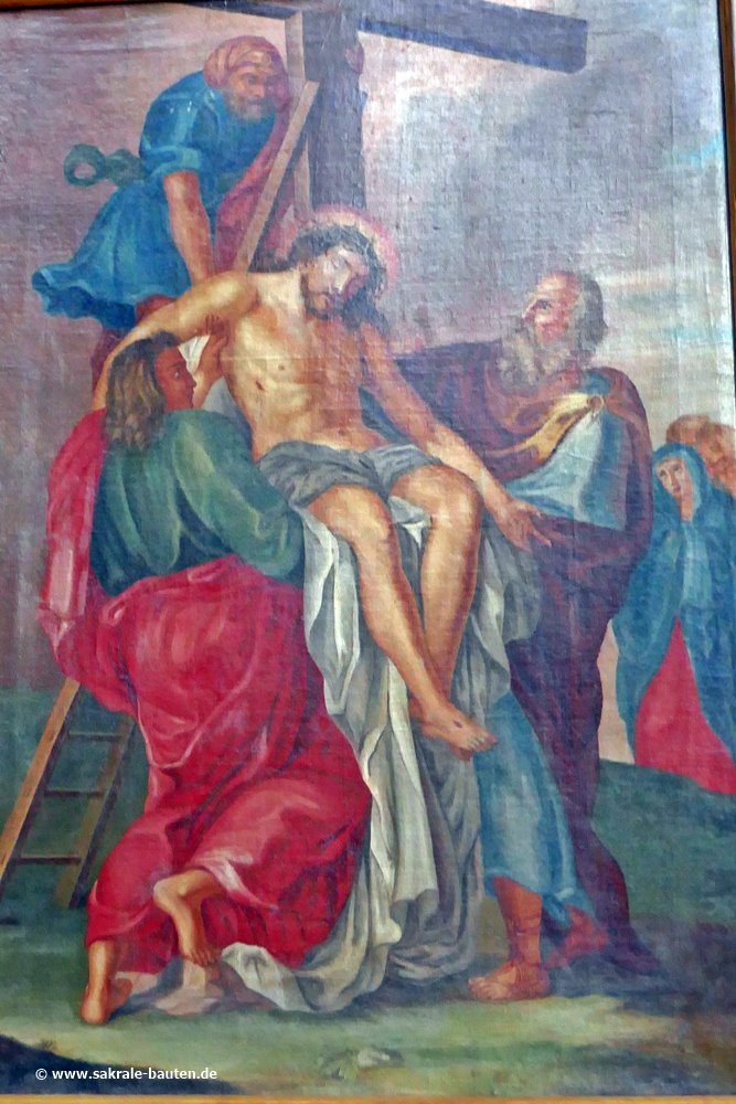 Die Szene, die in dieser Station dargestellt wird, ergibt sich aus der Kreuzabnahme Jesu, die in der Bibel erwähnt wird.