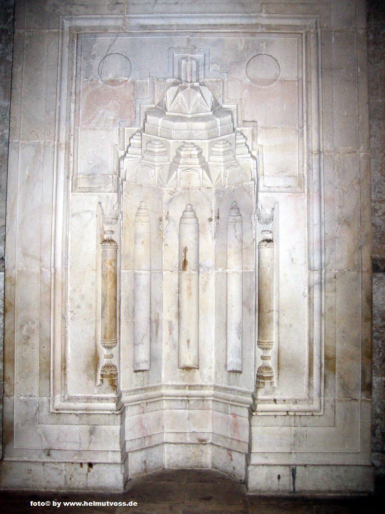 den eine bestickte Decke umhüllt und der mit silbernen Torakronen geschmückt ist. Die Wände zieren alte armenische Fliesen.
