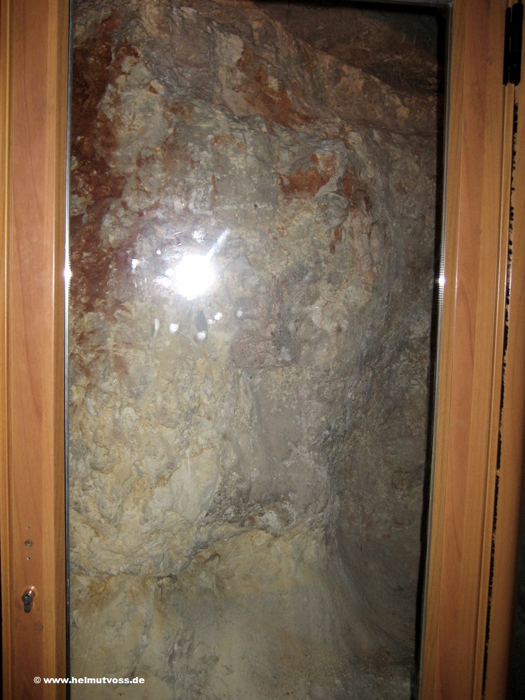 Heute kann man durch Glas das Originalgestein bewundern. Einbuchtungen sind da zu sehen, wo vielleicht einmal die Kreuze verankert waren.
