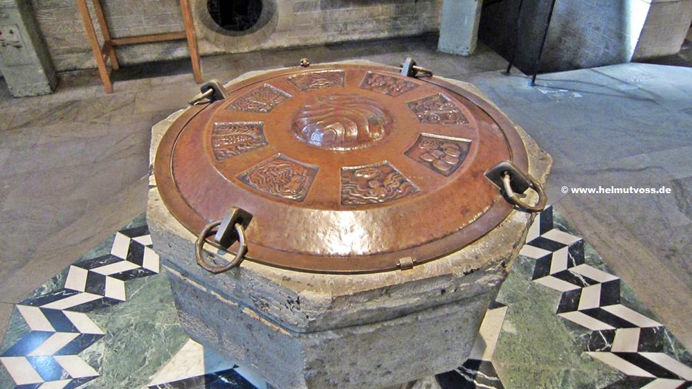 Das achteckige romanische Taufbecken um 1200 entstanden, wurde 1950 mit einer neuen Abdeckung versehen und im Zentrum der westlichen Vierung vor der Orgelempore aufgestellt.