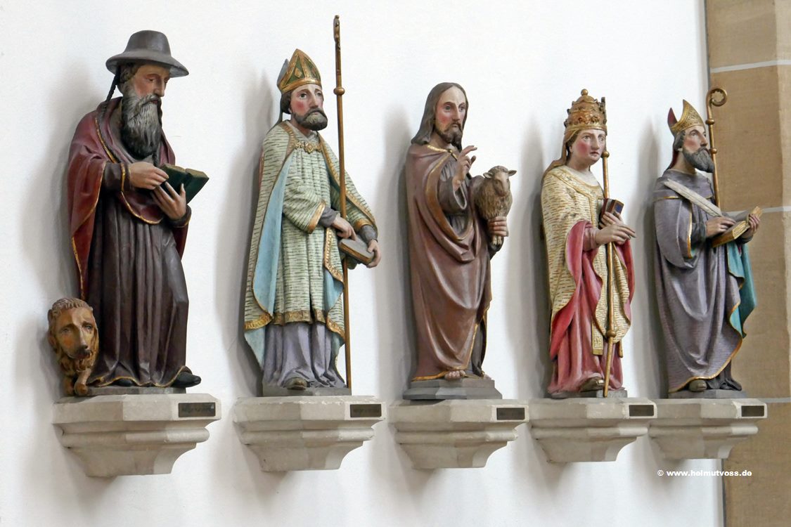 Längsseiten sind die zwölf Apostel eingeordnet. Die Kirchenpatrone stehen vor den Giebelseiten.
