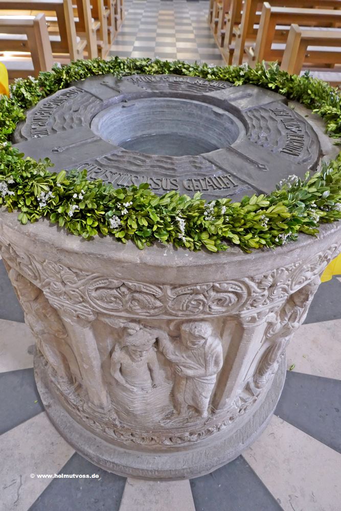 Der Taufstein aus der Mitte des 13. Jahrhunderts. Das Becken ist zylindrisch, zwischen Blattfriesen und Pilastern sind Reliefs der Taufe Christi zu sehen.