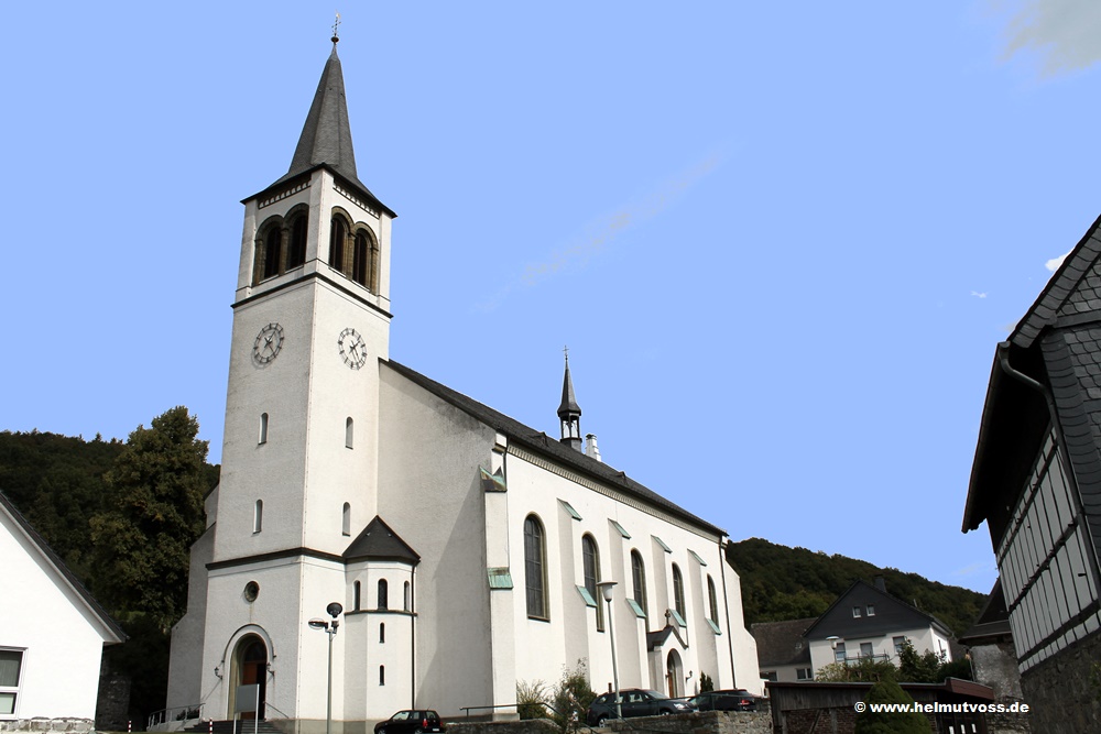 Die katholische Pfarrkirche St. Severin, die Kirche wurde von 1853 bis 1858 als dreischiffige Hallenkirche mit einem Westturm erbaut.