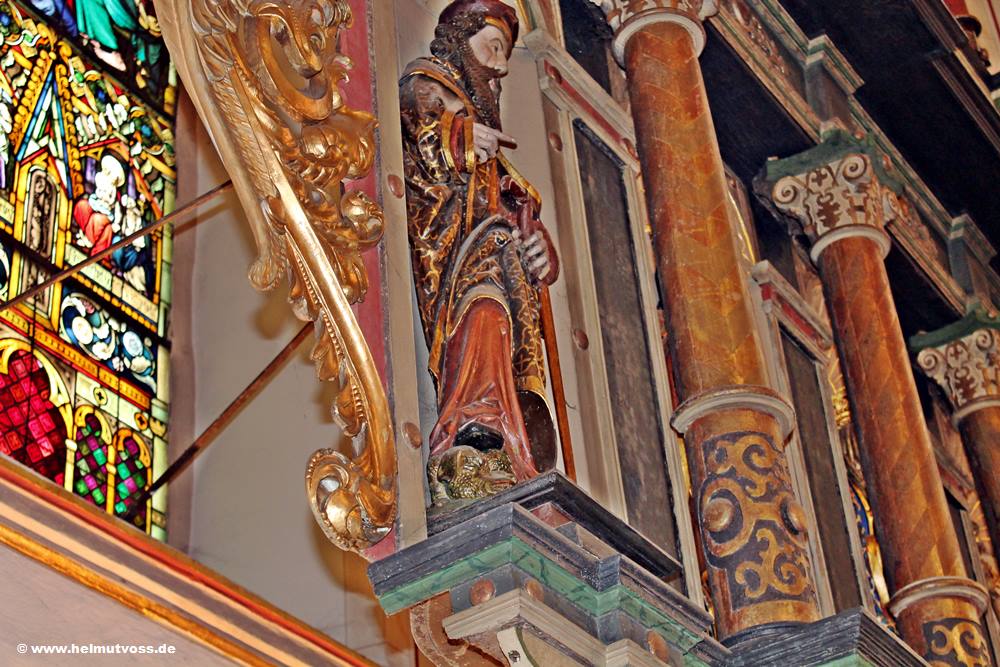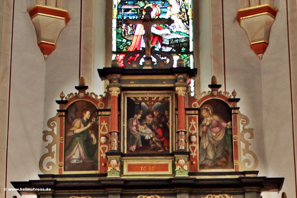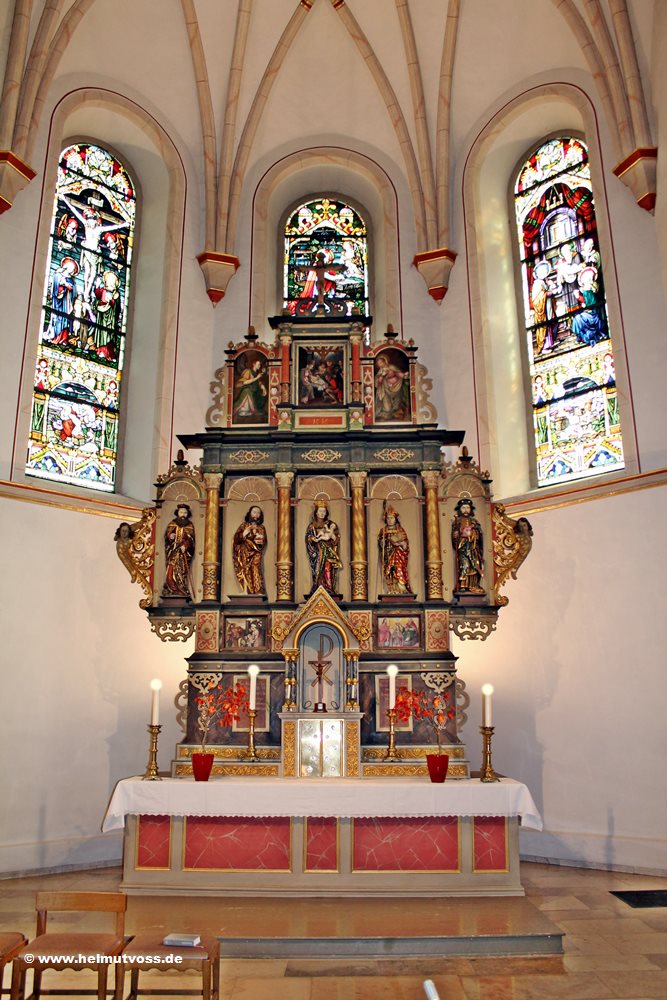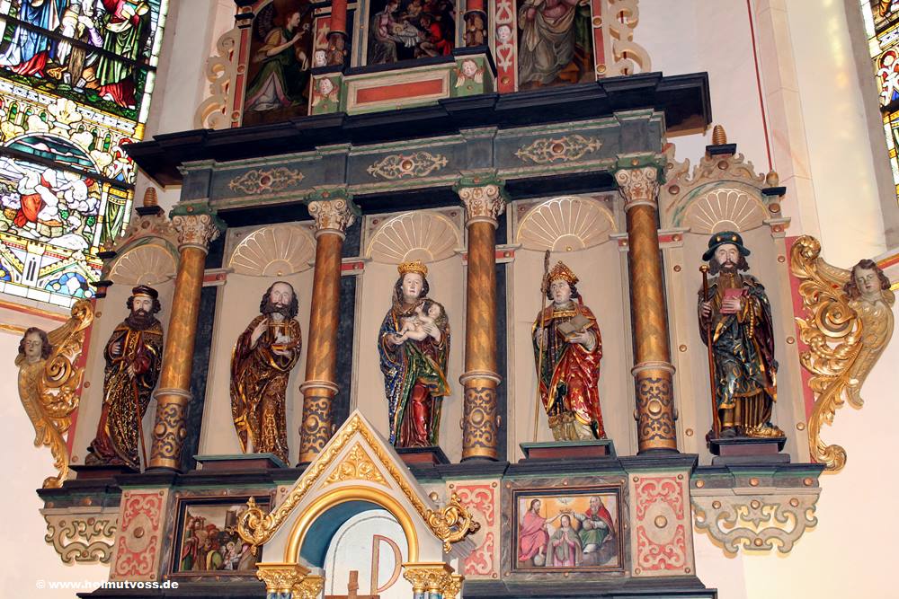 Bild 2: Hochaltar aus dem Jahr 1636. Er hat 5 Tafelbilder sowie 5 Heiligenskulpturen.