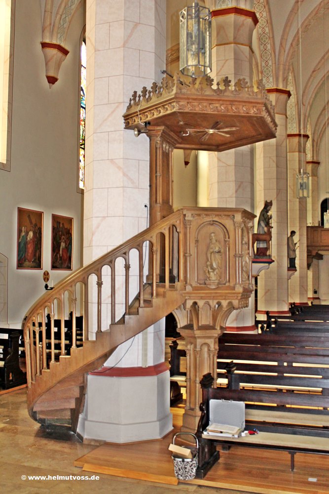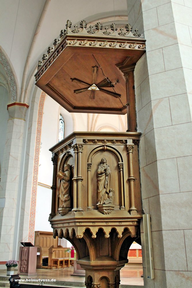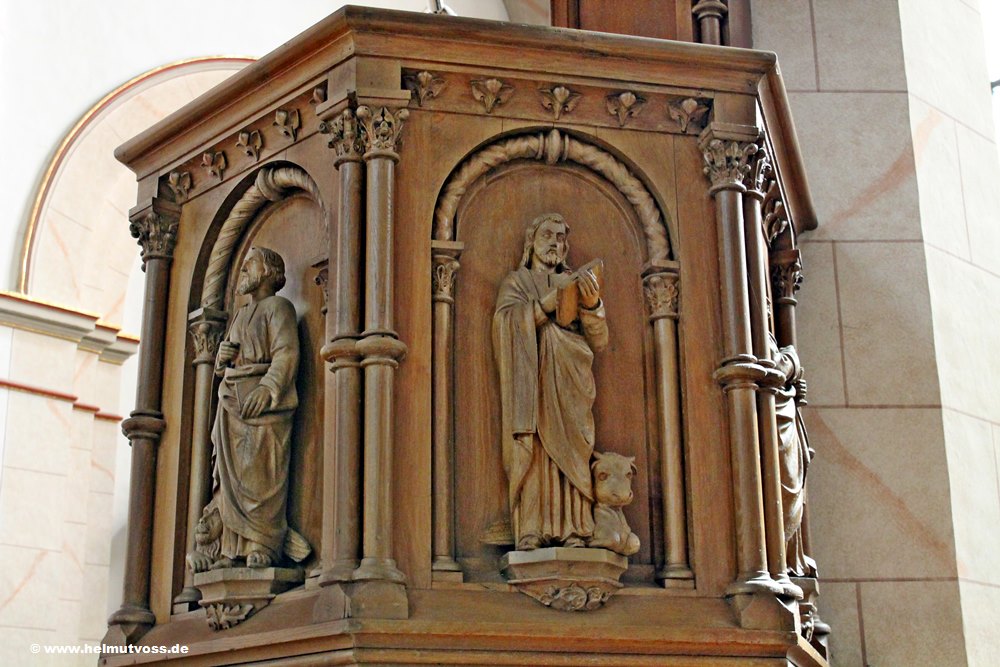 Ein geschwungener Treppenaufgang führt zum vierseitigen Kanzelkorb, die vier Evangelisten mit ihren Symbolen an der Kanzelbrüstung.