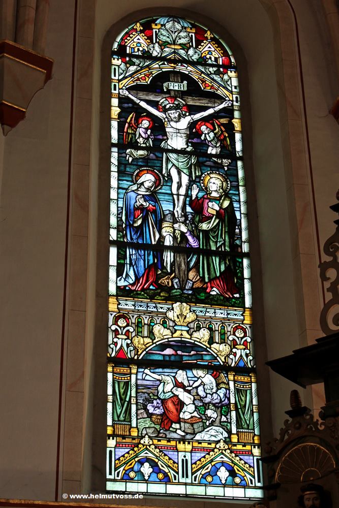 die Fenster im Chor zeigen die Auferstehung Christi, Maria und Johannes unter dem Kreuz und Jesus am Ölberg.