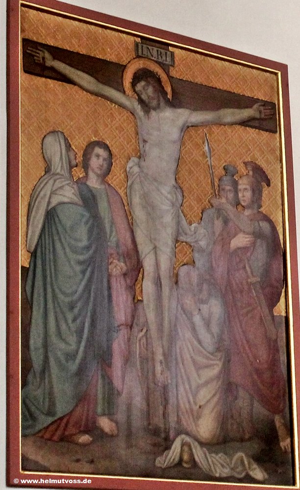 Bild 1: Maria und Johannes unter dem Kreuz, zu Jesu Füßen St. Maria Magdalena. Unten: Abrahams Opfer.