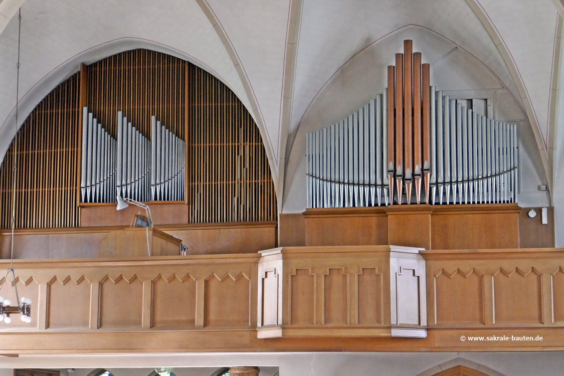 Jetzt richten wir den Blick auf die Orgel und das Gewölbe des vierten Jochs. Die zweimanualige Orgel mit 22 Registern baute 1953 die Firma Stockmann in Werl.