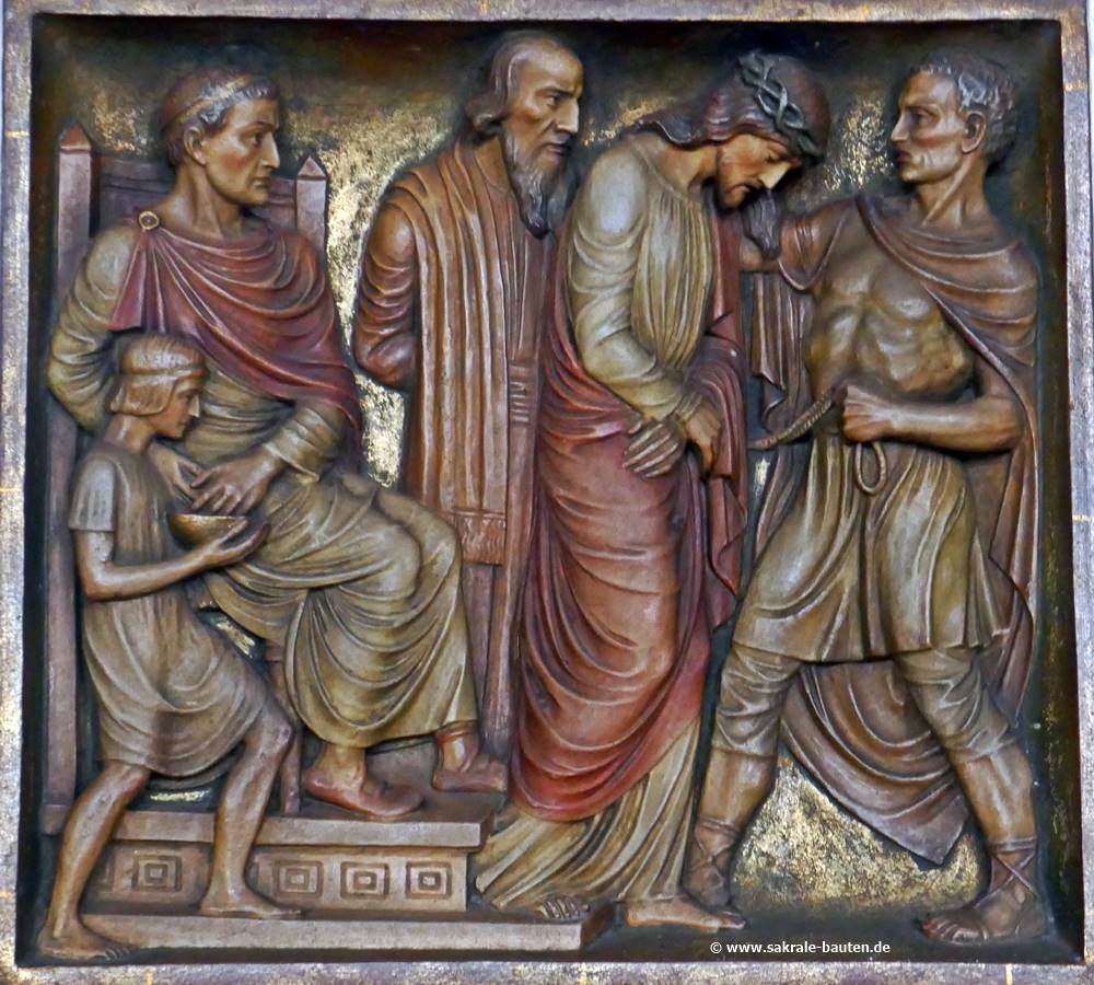 Das erste Bild zeigt den Herrn gebunden vor Pilatus stehen, der Jesus zum Tode verurteilt.