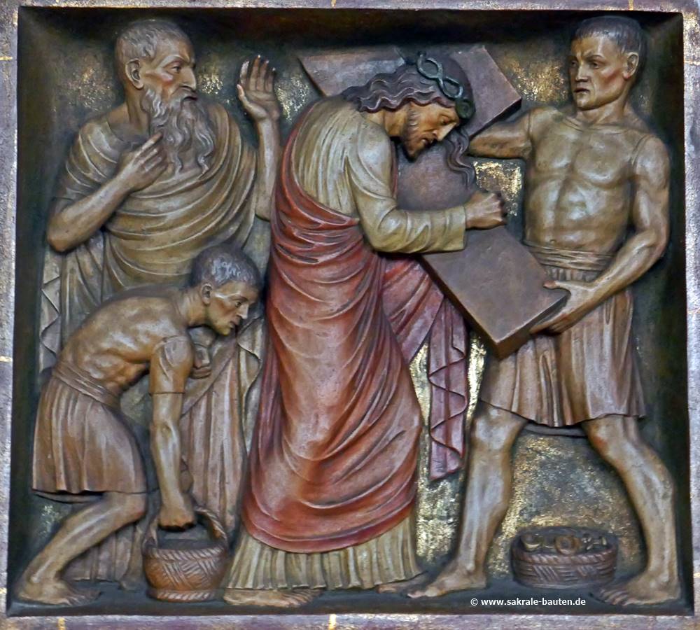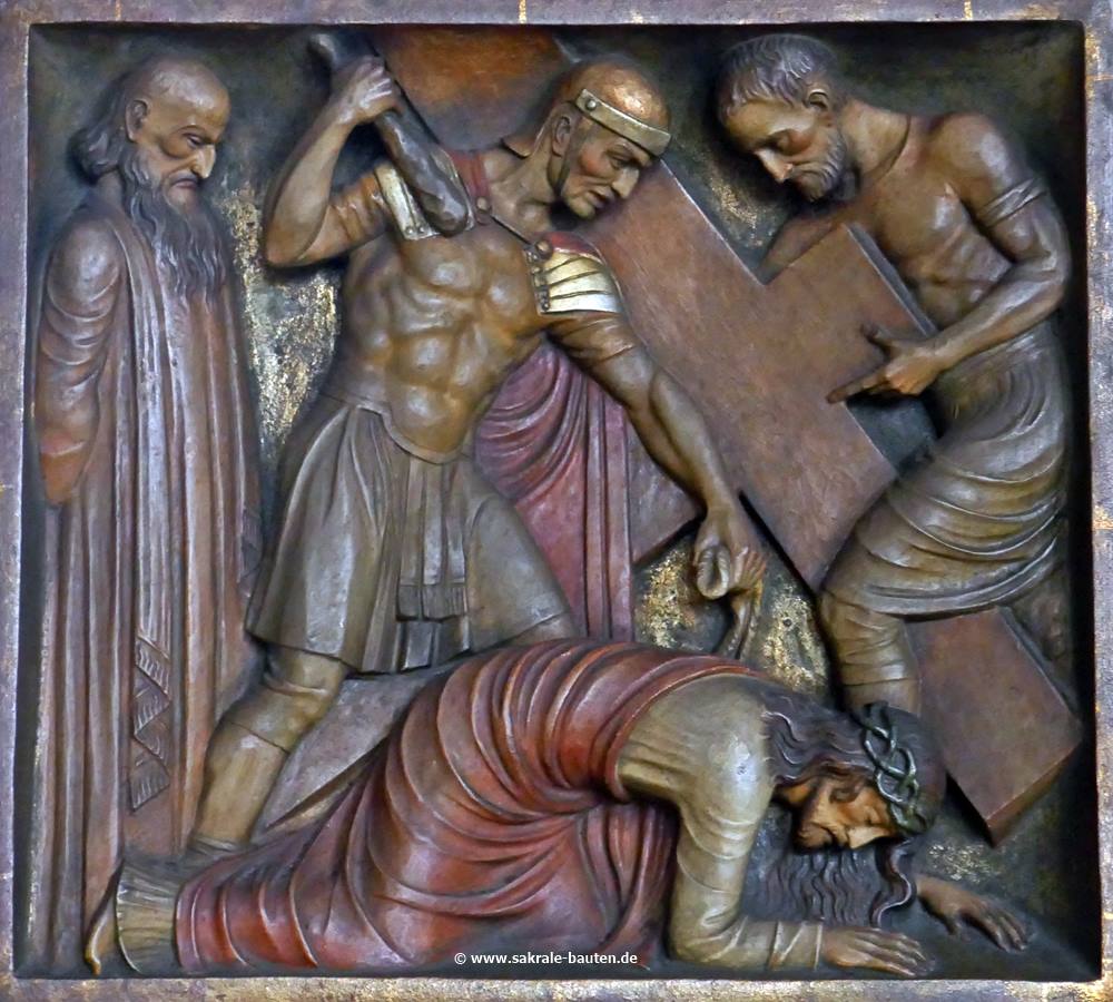 Jesus fällt unter der Last des Kreuzes. Im biblischen Ablauf der Leidensgeschichte Jesu gibt es diese Szene nicht.