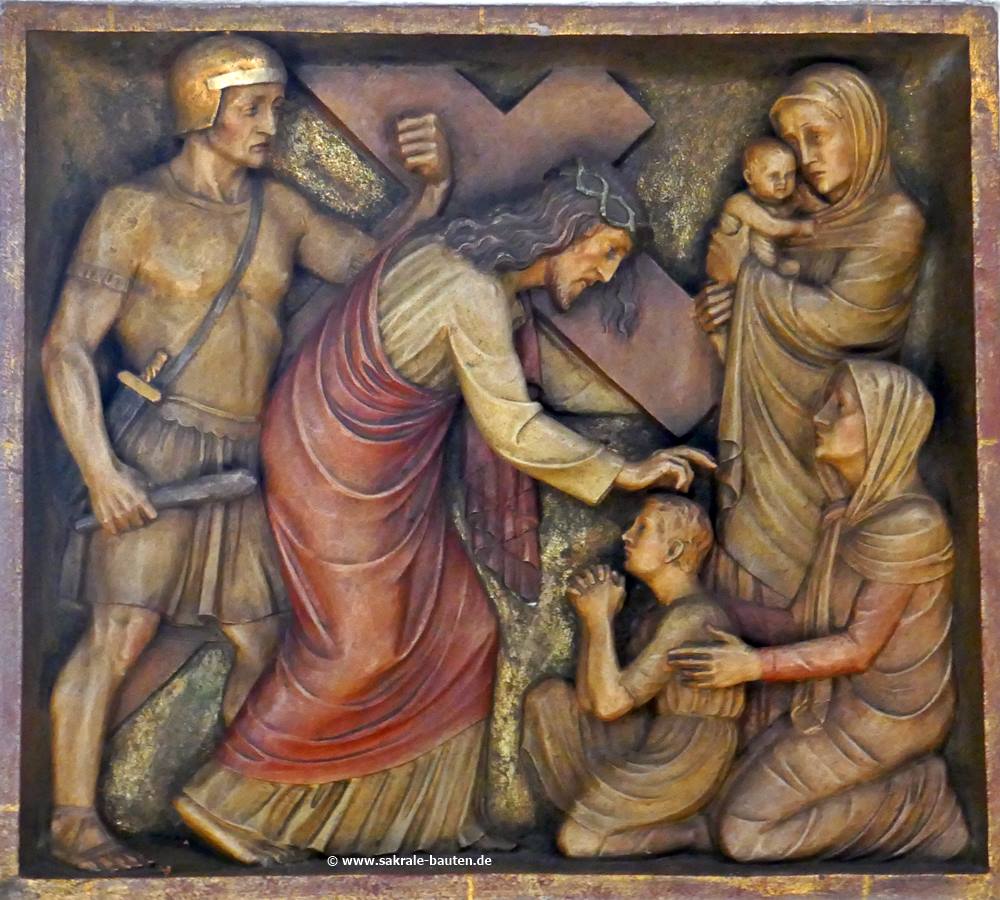 Jesus das Kreuz nachzutragen, findet sich folgender Text: Es folgte eine große Menschenmenge, darunter auch Frauen, die um ihn klagten und weinten. Jesus wandte sich zu ihnen um und sagte: