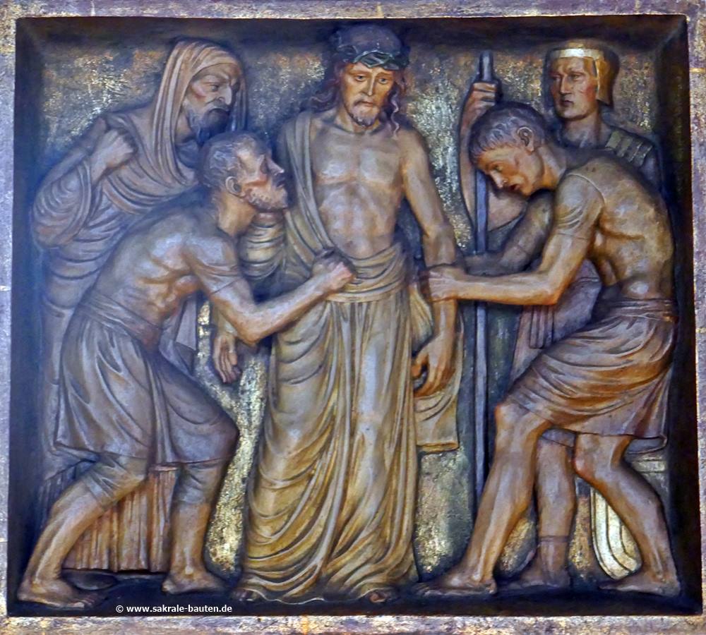 dass nach der Kreuzigung Jesu seine Kleidungsstücke per Losentscheid aufgeteilt wurden. Die Kreuzwegstation rückt den Moment in den Blick, da Jesus entkleidet wird.
