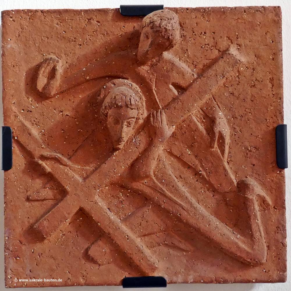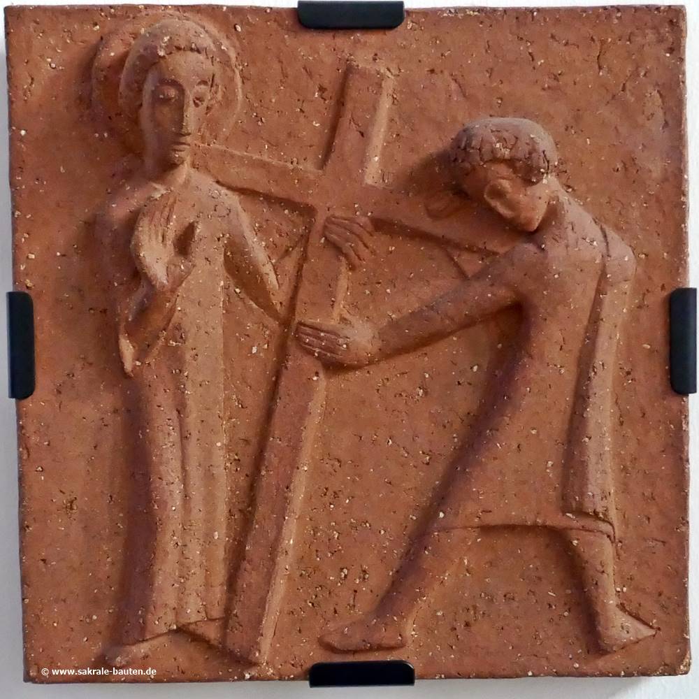 Die fünfte Station zeigt einen Mann, der Jesus das Kreuz trägt. Die Bibel kennt auch seinen Namen: Simon von Cyrene, der Vater des Alexander und Rufus.