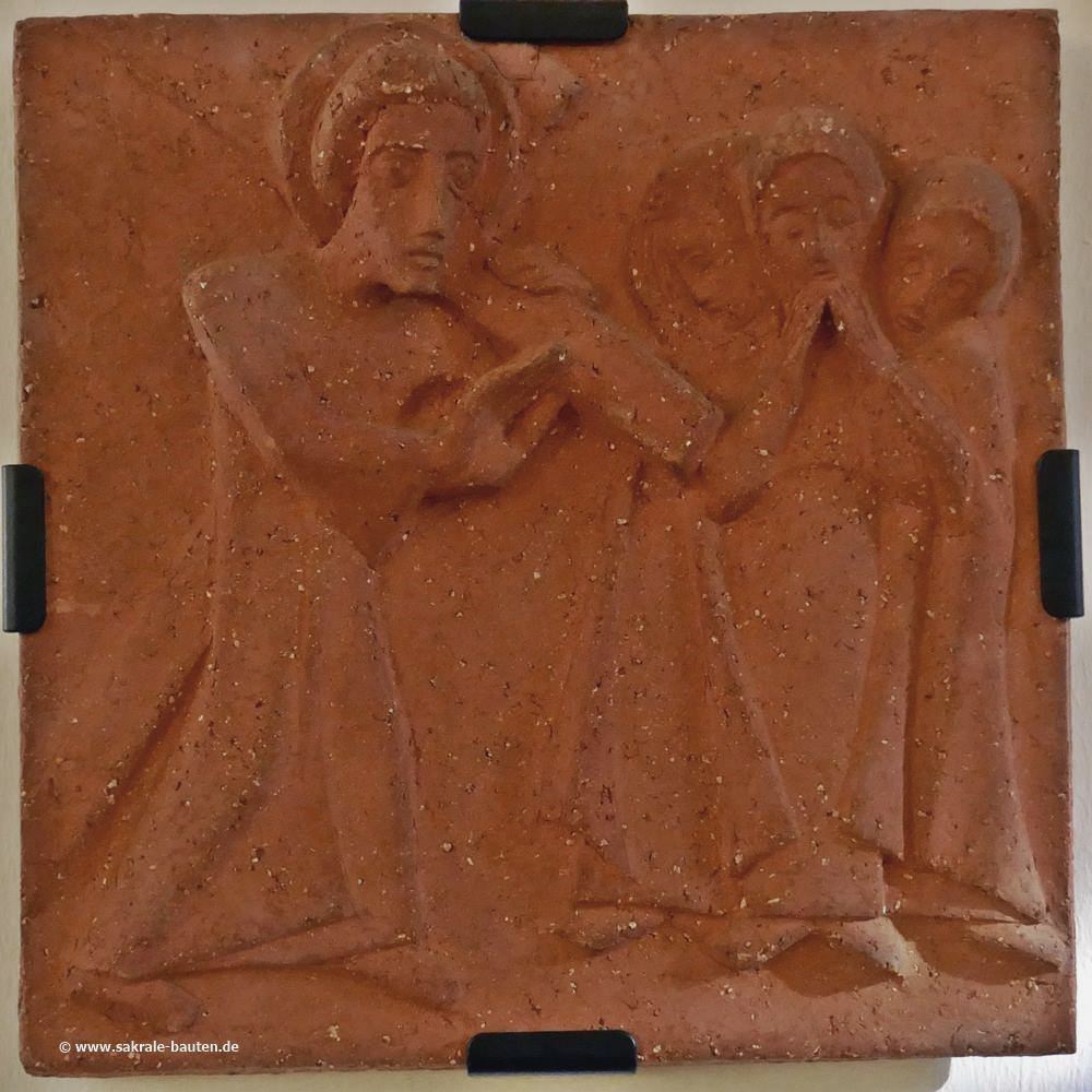 Jesus das Kreuz nachzutragen, findet sich folgender Text: Es folgte eine große Menschenmenge, darunter auch Frauen, die um ihn klagten und weinten. Jesus wandte sich zu ihnen um und sagte: