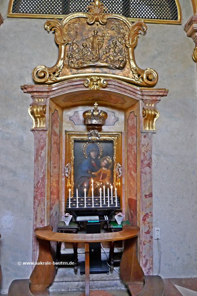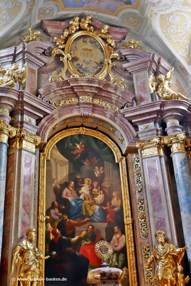 Bild 2: Der Chorraum ist vom Rest der Kirche durch eine Art Triumphbogen abgeteilt, dessen linken Teil eine Skulptur von Anna und Maria bildet.