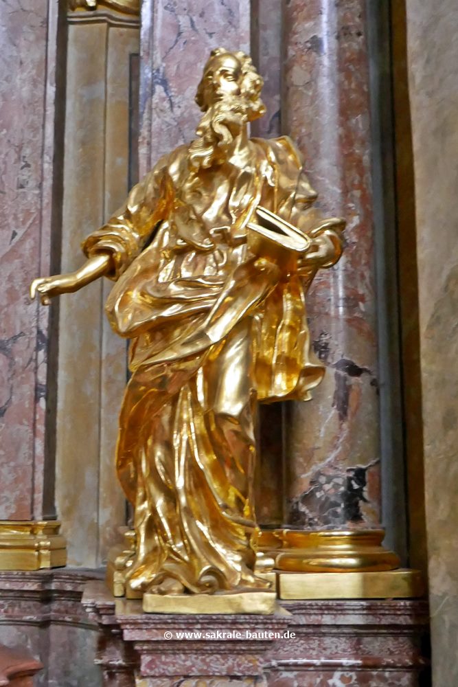 Die vergoldeten Figuren sollen laut Beschreibung der Kirche die Heiligen Karl Borromäus beziehungsweise Rochus darstellen.