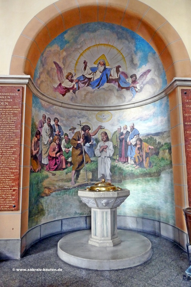 Bild 3: Taufkapelle. Taufbecken vor dem Bild der Jesus Taufe.