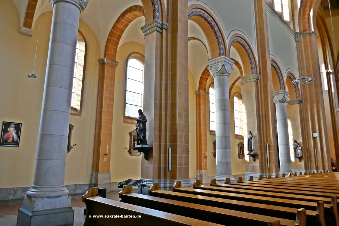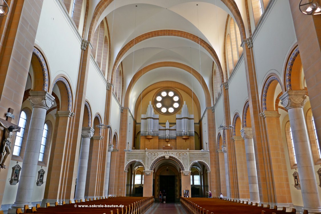 Im Vergleich zum monumentalen Äußeren der Kirche, zeigt sich ihr Innenraum überraschend schlicht. Blick durch das Kirchenschiff gegen den Hauptaltar.