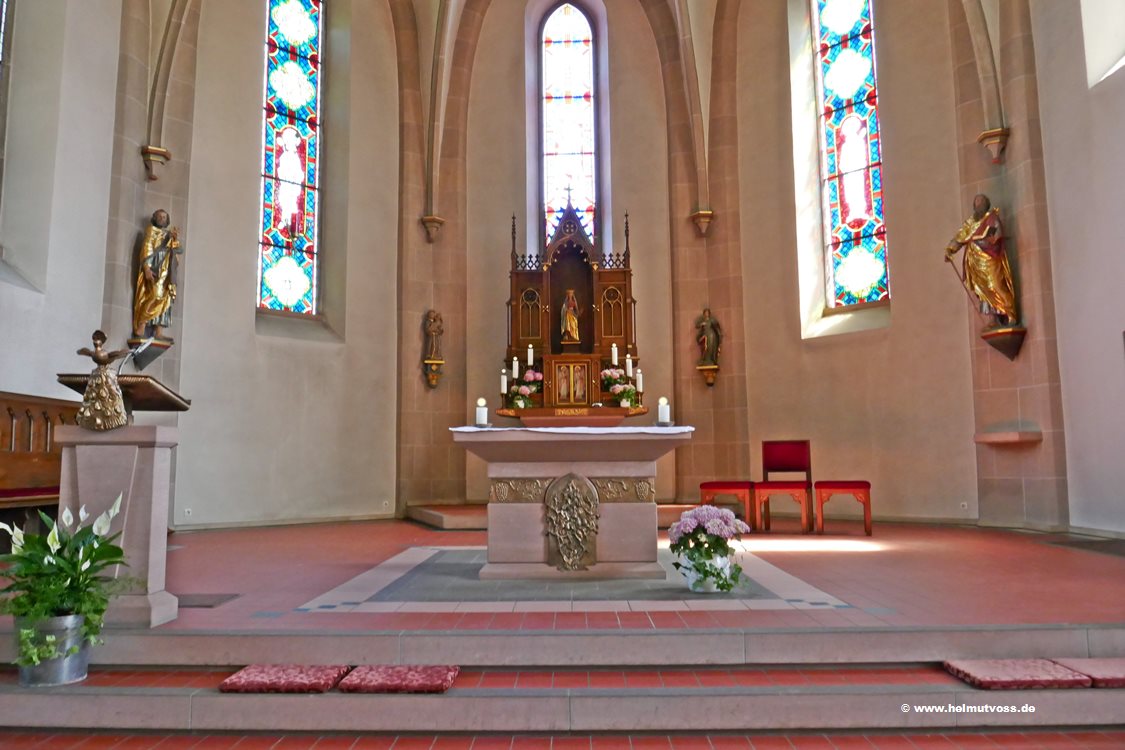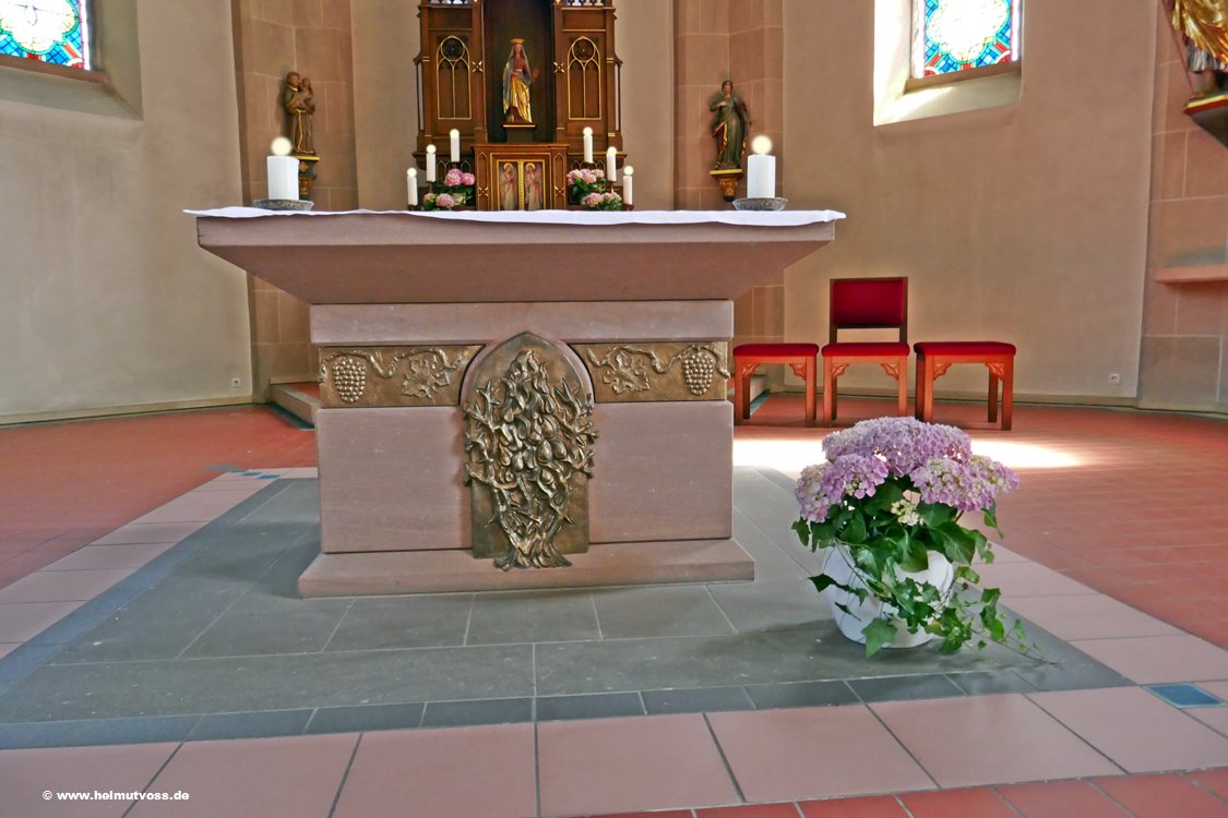 Nach der Zerstörung des Altars aus Sandstein wurde 1952 ein Altar aus rötlichem Marmor angeschafft.