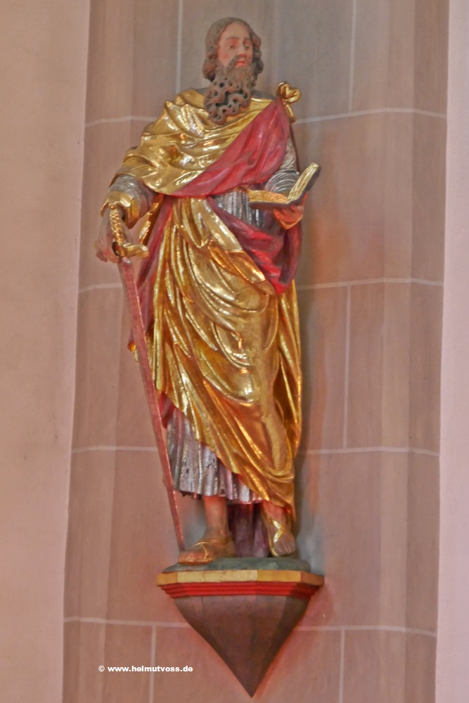 Die Figuren an der Vorderseite der Brüstung der Orgelbühne, links der hl. Liborius als Patron des Erzbistums Paderborn,