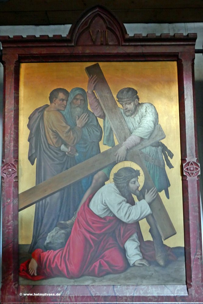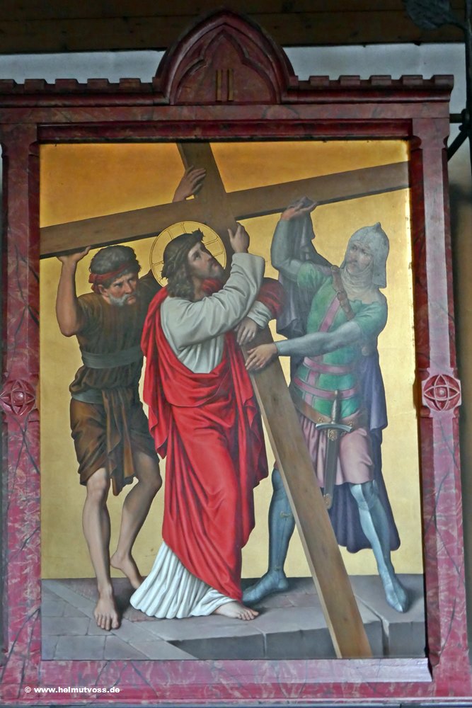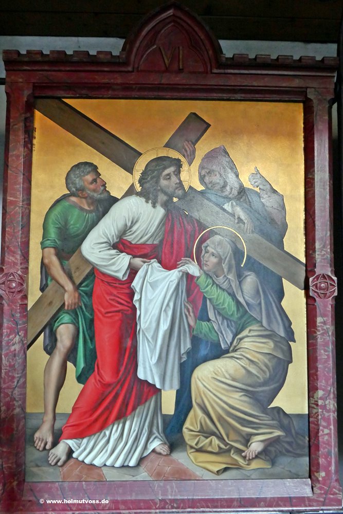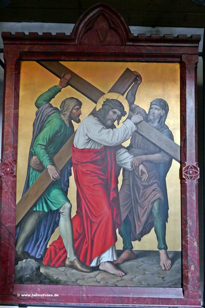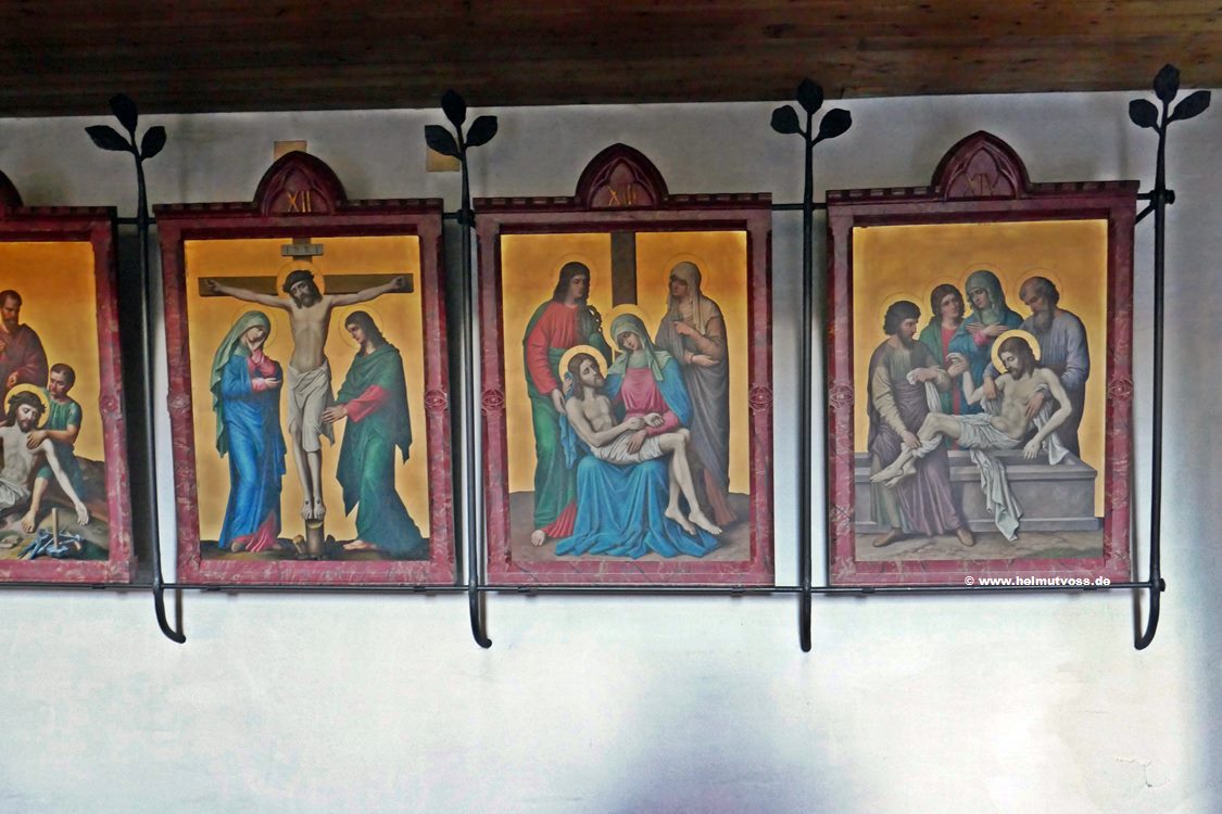 Der Kreuzweg stammt aus der Vorgängerkirche er besteht aus bemalten Bronzetafeln und ist sehr wertvoll.