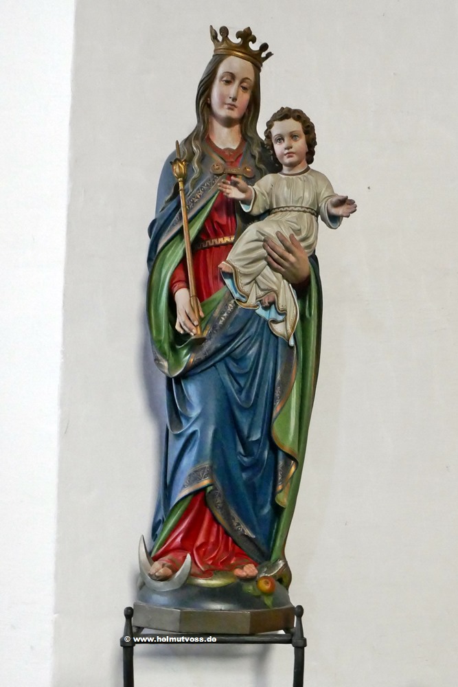 Der dreiteilige Retabel ist aus der Vorgängerkirche. Links im Altar die Hl. Luzia und der Hl. Lazarus. Rechts im Altar der Hl.Liborius und die Hl.Agatha.