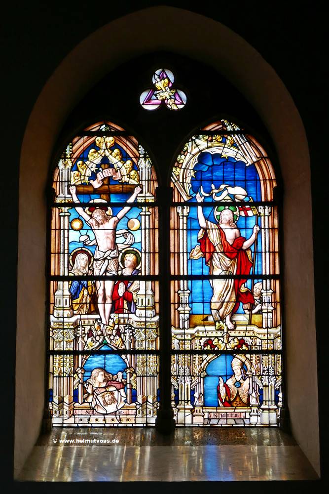 Bild 2: Fenster im Schiff, Maria und Johannes unter dem Kreuz; Christi Auferstehung. Fa. Dr. Heinrich Oidtmann, um 1900.