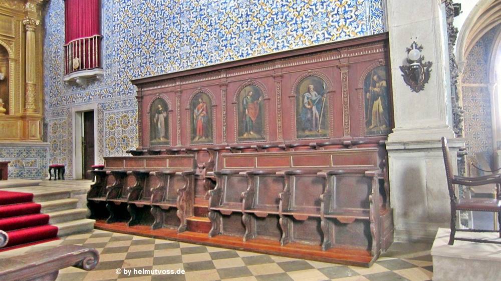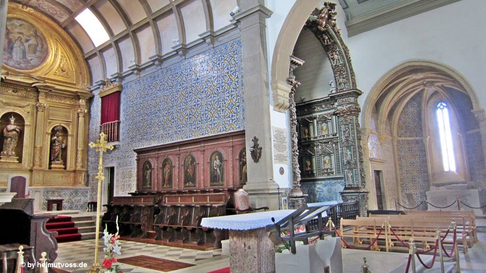 Die Wände sind mit reich verzierten Azulejos Fliesen ausgekleidet. Der Gang zwischen dem Gestühl der Kathedrale von Faro gleicht einer Entdeckungsreise.