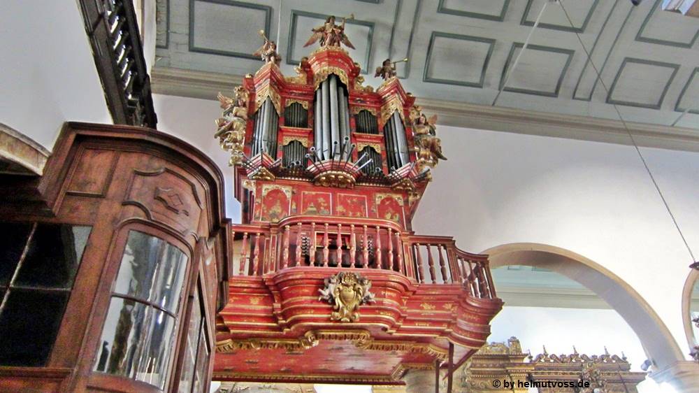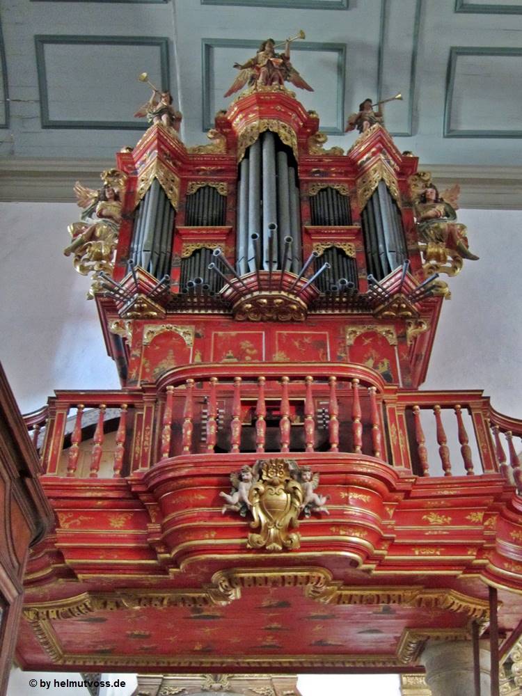 Prachtvoll korallenfarben leuchtet die Barockorgel auf der Empore. Die Orgel wurde 1715/16 durch den Schnitger-Gesellen Johann Heinrich Ulenkampf in Faro aufgebaut.