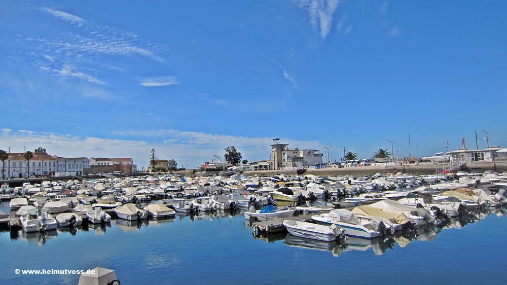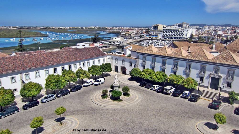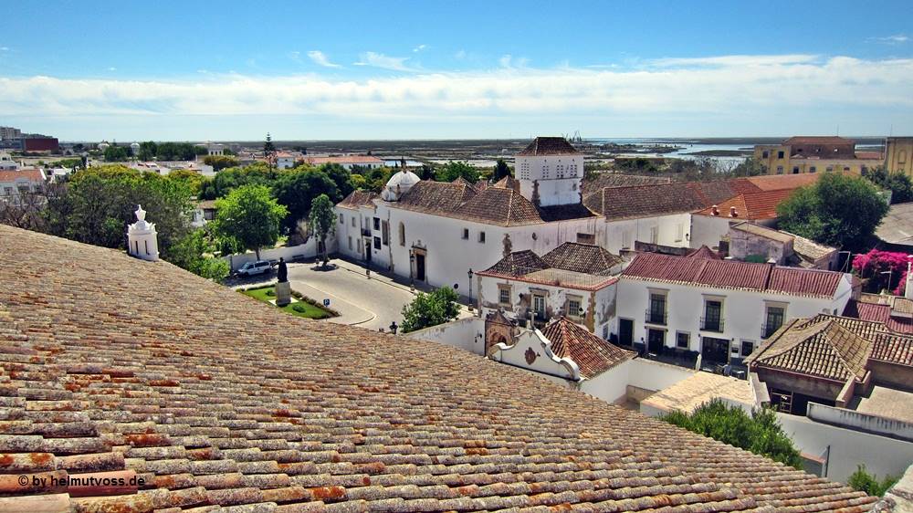 Über die Dächer der Altstadt hinweg schaut man auf das moderne Faro mit den Einkaufsstraßen, nach Westen der Flughafen und nach Süden der Naturpark Ria Formosa direkt am Meer.