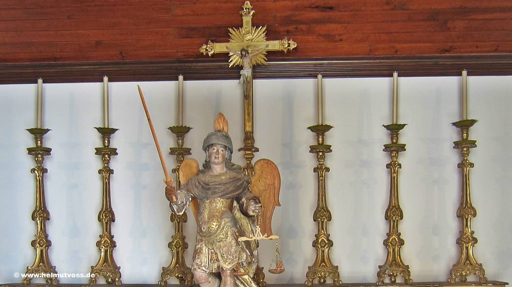 Vor dem Altar abgebildet sind der Erzengel Michael mit Schwert und Seelenwaage.